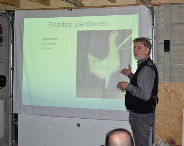 Na een korte pauze nam Aad Stout ons mee in de wereld van de sierduivenfokkerij. De vele rassen werden systematisch behandeld aan de hand van de verschillende soorten sierduiven. Kropperrassen, vormduiven, jazelfs kipduiven blijken te bestaan, en nog veel meer…. Een grote variatie in uiterlijke kenmerken bracht Aad aan de hand van duidelijke beelden voor het voetlicht. Als keurmeester kon Aad ook nog eens duidelijk aangeven waarom de ene duif een mooiere vertegenwoordiger van het ras was dan de andere.
